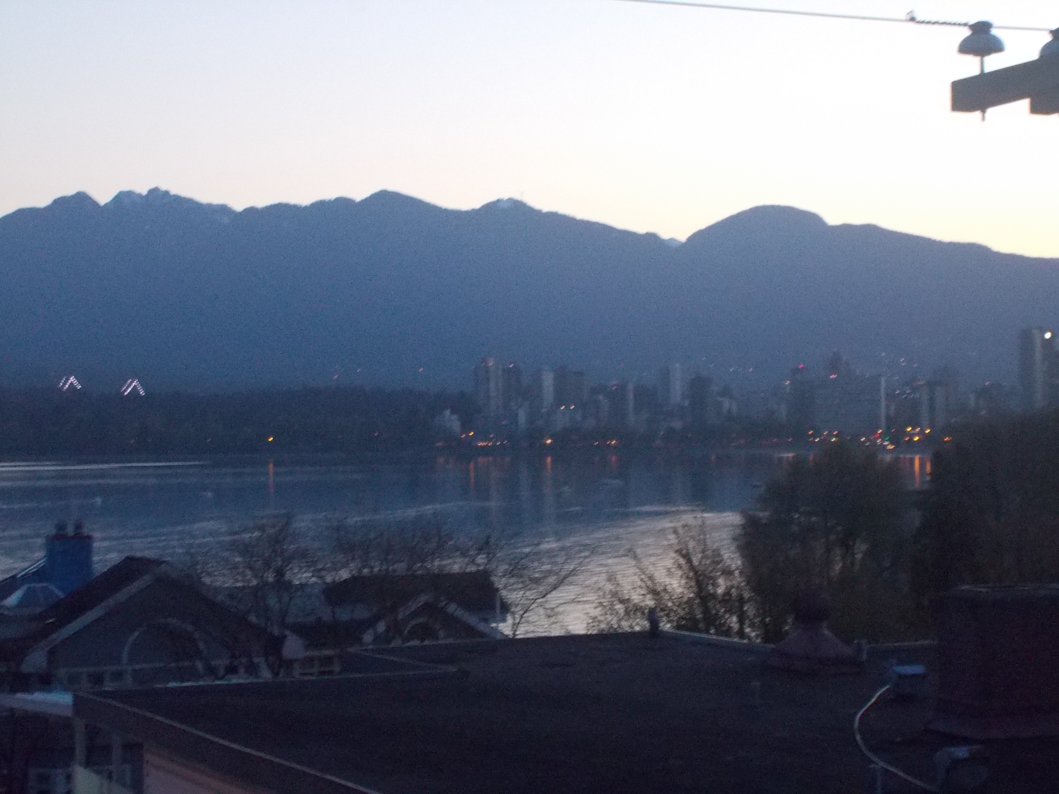 Turns out this one overlooks English Bay, the downtown skyline, and North Vancouver and the ski hills above it. The large balcony is equipped as an outdoor living room, so we plan to spend a good deal of time there, though I may need to negotiate with this one large sea gull who seems to own the post adjoining the balcony.