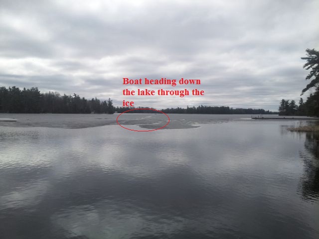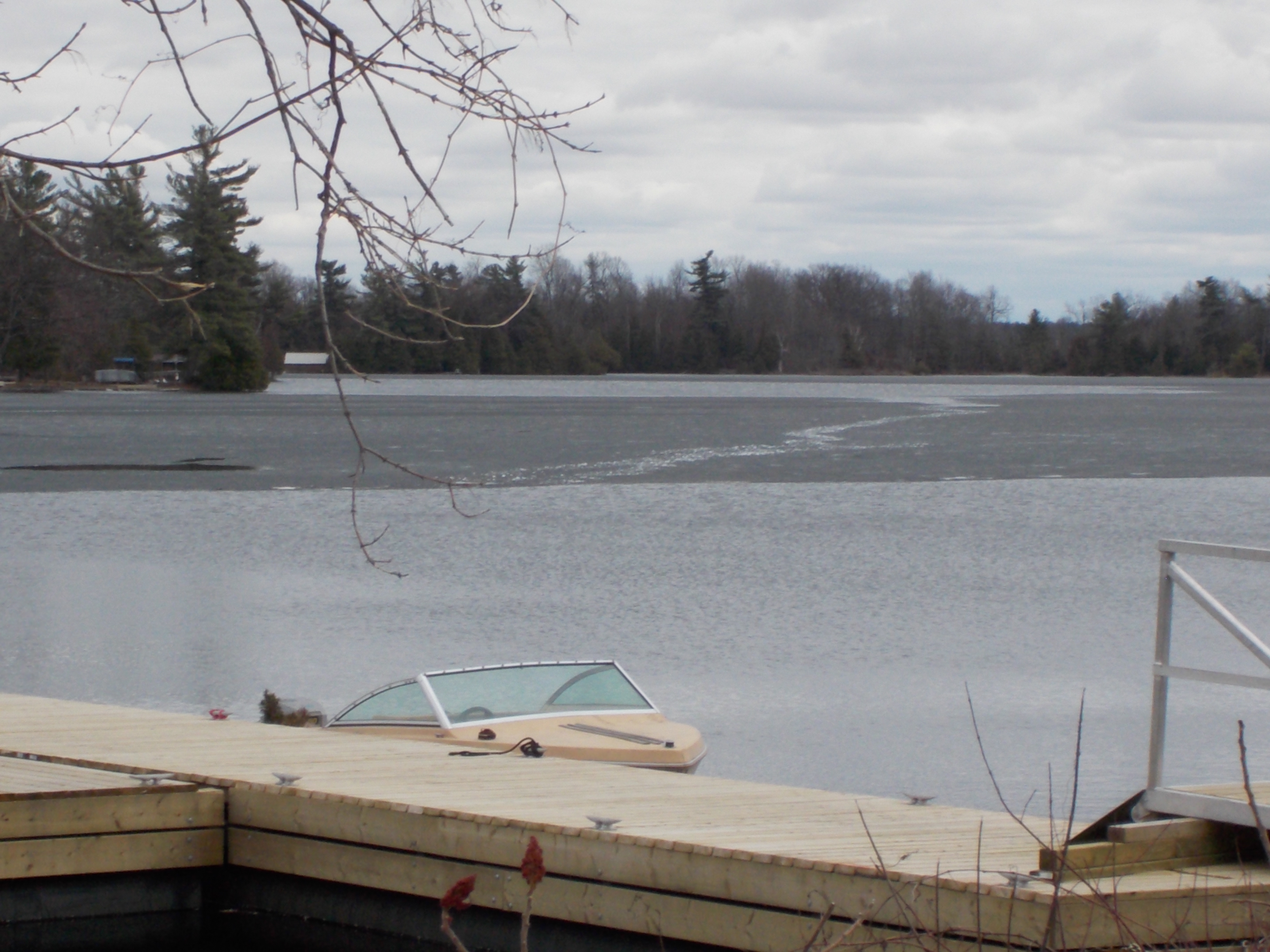 You were right, Keith. At 1:00 p.m. today I looked from Hwy 42 to see a large ice floe in the middle of Newboro Lake. I turned around and brought my boat home.