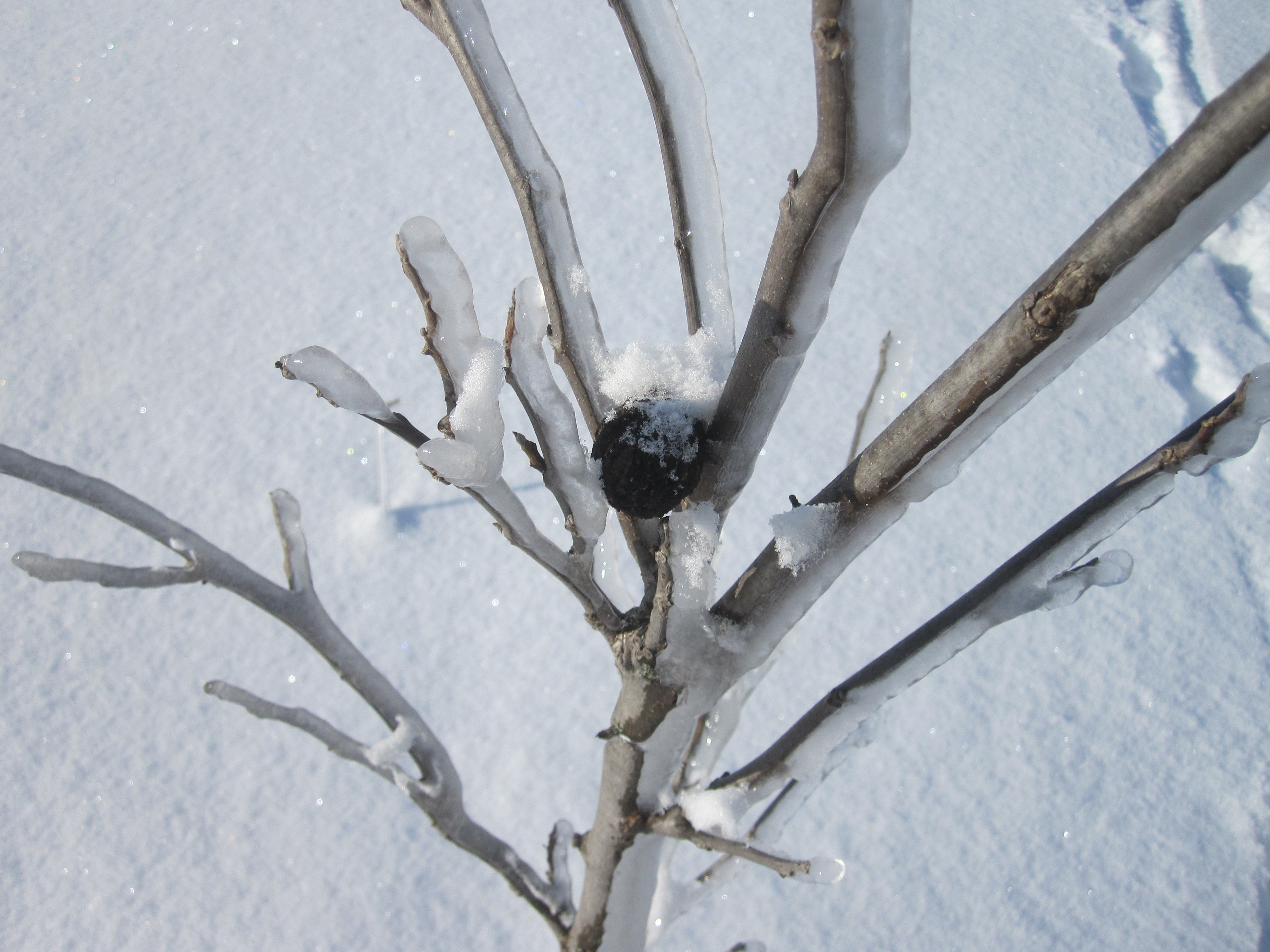 Squirrels were active in the woods this morning. Reds have littered the snow with walnut hulls from four different caches around the large walnut trees back the lane. A creature (I suspect a gray squirrel) has developed an idiosyncratic caching method for black walnuts: it leaves them in the top branches of pine and walnut seedlings hundreds of feet from the seed source.