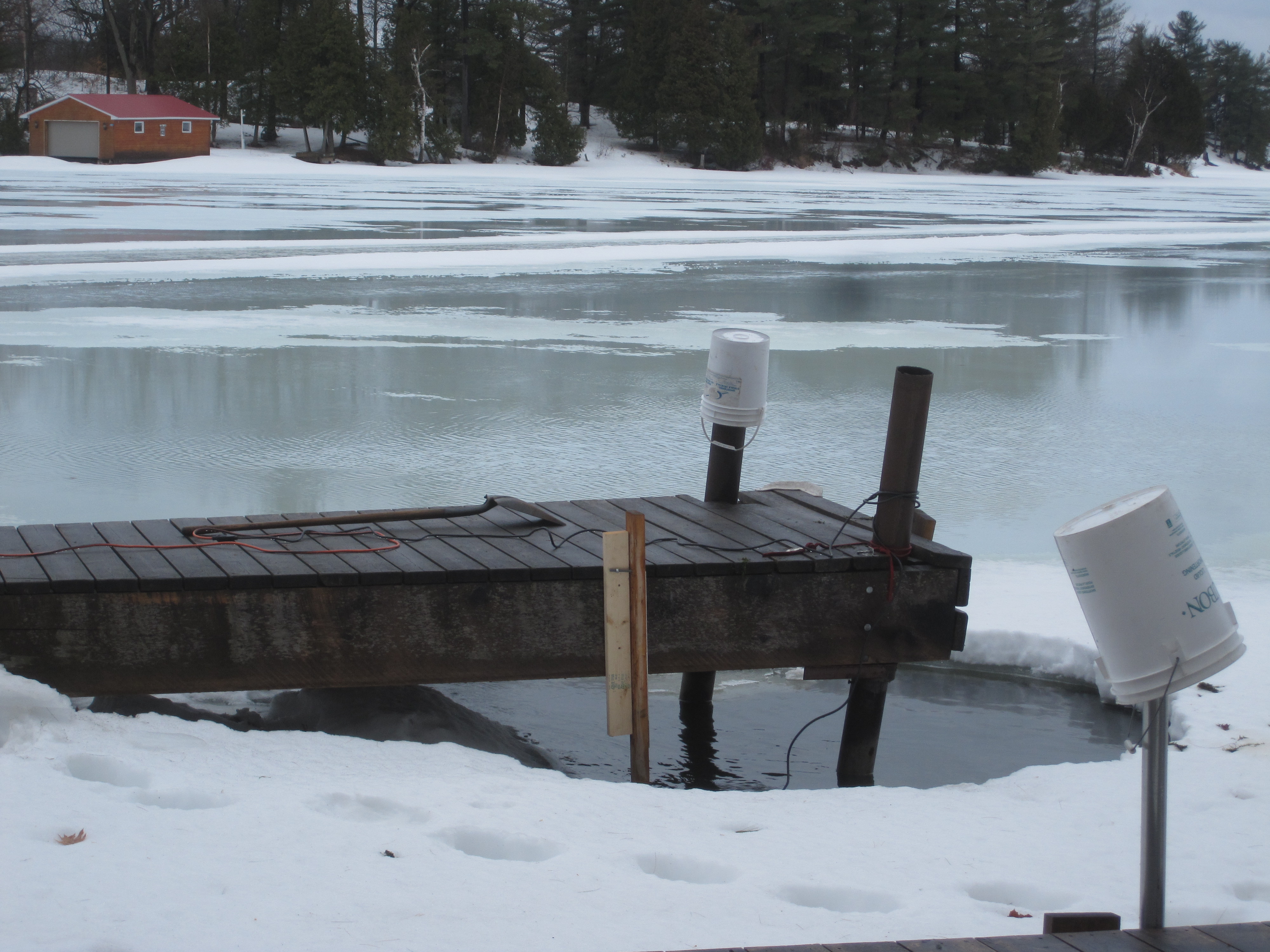 A heavy rain last night has changed the look of the lake. Water level remains very low and the ice very thick, to the point that the bubbler at the end of Tony’s dock seems to be trying to carve out ice frozen to the bottom.