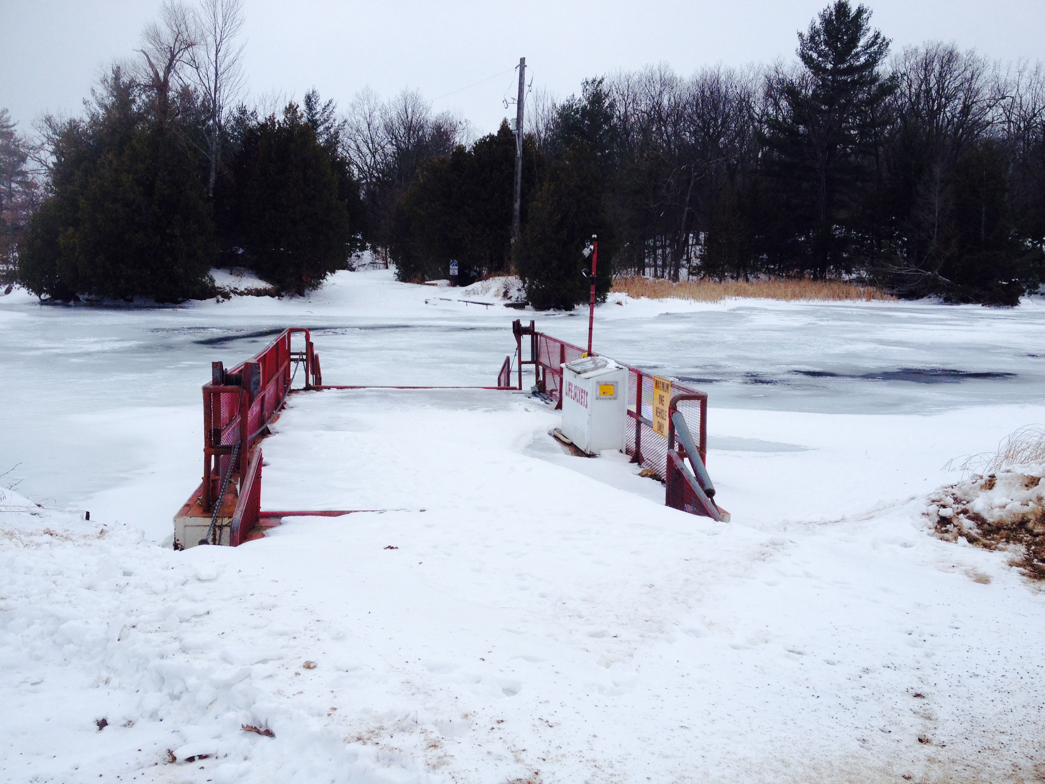 With an overnight low of -11C the ice seems to have hardened a bit in Newboro Harbour and I measured 6 1/2″ on one hole drilled off the launch ramp at the end of Water Street, but I noticed no tracks around the public docks and a barge beached to the side of the launch ramp.