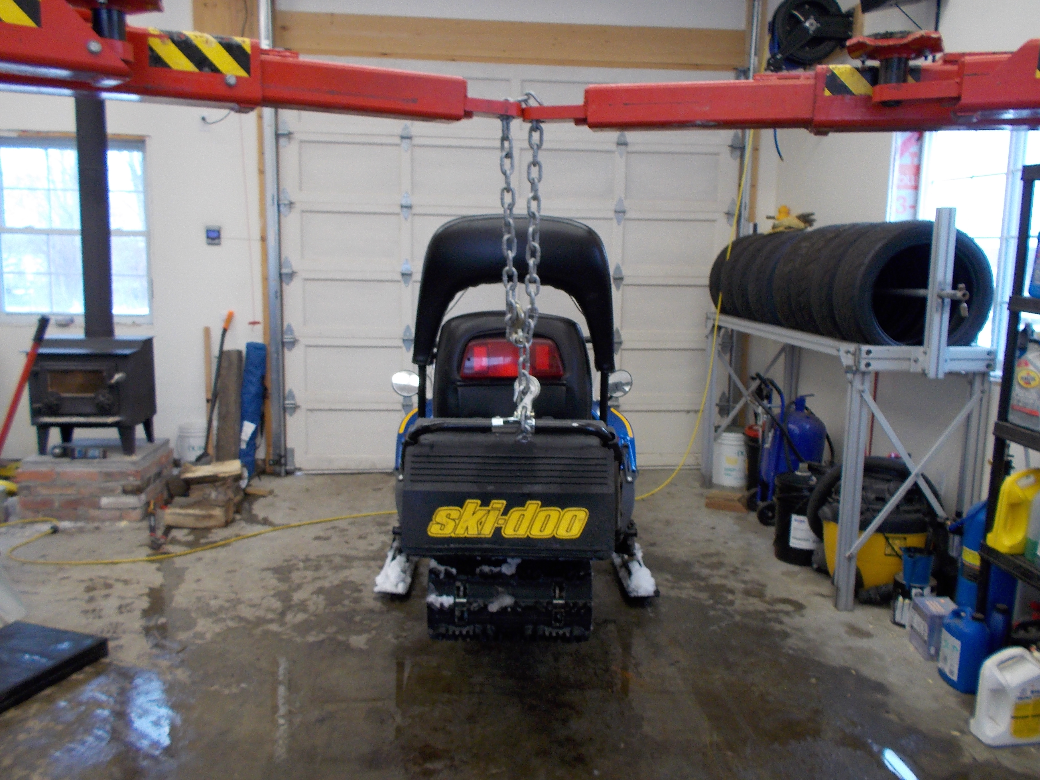 But the steering was still much too vague. This morning I figured out a way to lift the front of the Ski Doo with the car hoist so that I could examine the steering linkage at my leisure. The central bolt proved loose. A few more turns with the 18 mm socket did the job. The skis no longer seemed cross-eyed.