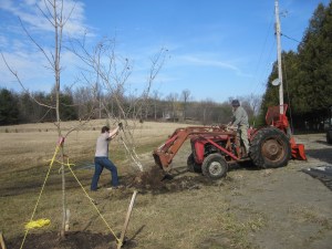 Around the house on Young’s Hill I used the same technique: dig a hole with the forked bucket on the loader. Then, as soon as the footing allowed it during spring thaw, drive into the woods and pick up an appropriate maple to fill the hole. Keep the tree out of the ground for as little time as possible. Water sporadically the following summer.