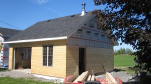 Today two saws, a jointer, and my prized Poitras shaper made the trip to the barn. This made me sad. It was like leaving the comfort and security of my childhood home. Funny, the beds, the food, two computers and a television are still there, but it’s the shaper I miss. And I haven’t even had the thing for that long, only about three years. But it’s had a hand in everything good or interesting I have done in this renovation: the flooring, the cabinets, those muntined glass doors Bet insisted upon, the passage and entrance doors, the windows, the baseboards, the stairs, the crown moulding over the doors and windows, even the ceiling and window paneling – it all came off that shaper.